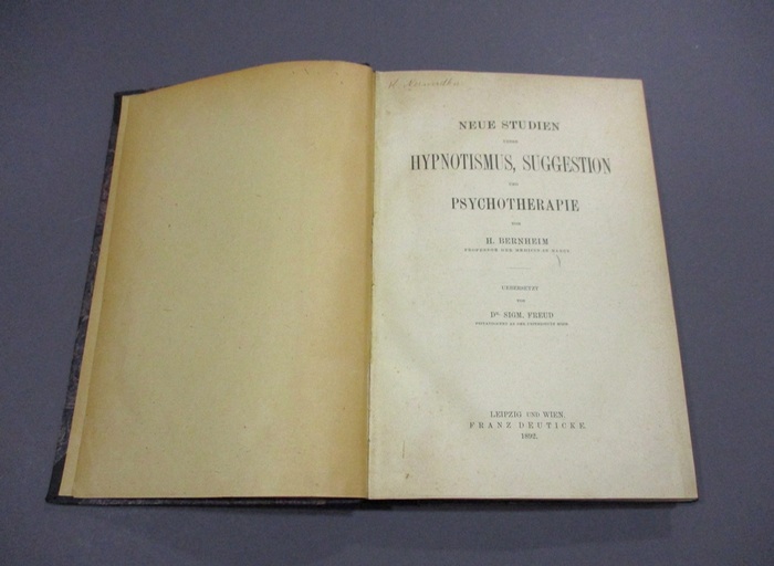 Neue Studien ueber Hypnotismus, Suggestion und Psychotherapie. Uebersetzt von Sigm(und) Freud. Leipzig, Deuticke, 1892. XII, 380 S. Gr.-8°. HLwd. der Zeit mit Rückentitel (bestoßen und etw. berieben). Erste deutsche Ausgabe in der Übersetzung von Sigmund Freud, selten. - Hippolyte Marie Bernheim (1840 - 1919) war einer der führenden Forscher auf diesem Gebiet der Hypnose. "1882 übernahm Bernheim die von dem ärztlichen Magnetiseur Ambroise-Auguste Liébeault (1823?1904) entwickelte Methode der Suggestion in die Schule von Nancy. Bis zu diesem Zeitpunkt war die Hypnose hauptsächlich als Showeffekt genutzt worden. Bernheim widersprach der damals verbreiteten These, nur Hysteriker könnten hypnotisiert werden. Vielmehr war er der Meinung, die Hypnose wäre ein normales, unpathologisches Phänomen, das als psychische Reaktion auf Suggestionen einträte und nicht, wie damals oft vermutet wurde, von Magneten und Metallen beeinflusst werden konnte. Die von ihm 1884 formulierte Suggestionslehre löste ältere Hypnose- bzw. Somnambulismus-Konzepte des Mesmerismus, des animalischen Magnetismus und der Od-Lehre Reichenbachs ab. Im Jahr 1889 besuchte der Wiener Arzt Sigmund Freud Bernheim und ließ sich über dessen Experimente mit der sogenannten posthypnotischen Suggestion informieren. Aus Bernheims Versuchsergebnissen folgerte Freud, dass es ein Unbewusstes geben müsse" (Wikipedia Abruf vom 17.06.2024). - Gebräunt.
