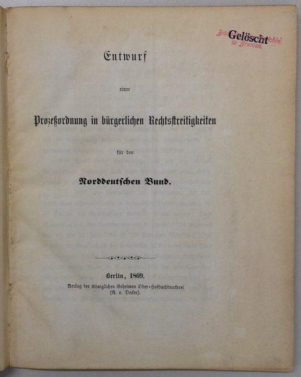 Entwurf einer Prozeßordnung in bürgerlichen Rechtsstreitigkeiten für den Norddeutschen Bund. Berlin, Verlag der Königlichen Geheimen Ober-Hofbuchdruckerei (R. v. Decker), 1869. 4to. X, 182 S. Interimshalbleinen d. Zeit (leicht berieben, Ecken bestoßen). Erste Ausgabe des Entwurfs, den eine Kommission des Norddeutschen Bundes seit Januar 1868 ausgearbeitet hatte. Unter Abschaffung der Privatgerichtsbarkeit, aber unter Beibehaltung gewisser Privilegien der Regierenden Häuser wurden die Instanzen für den Bund neu geordnet. - Breitrandig. Gebräunt, in den Rändern stärker. Titel gestempelt.