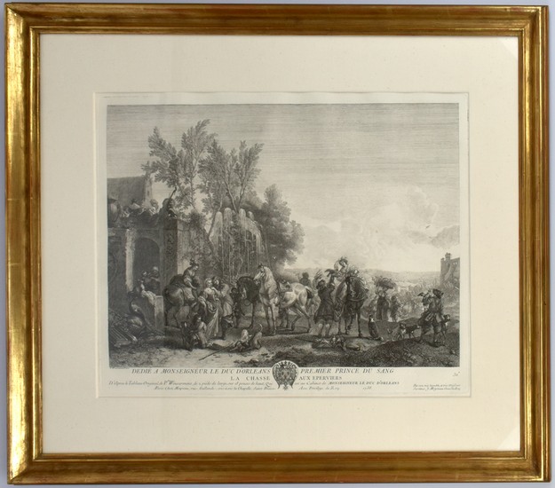 La chasse aux Eperviers. 1738. [Original-Radierung, gerahmt / original etching, framed]. _. (Jean-Michel Moreau, geb. 1741 in Paris, gest. ebenda, französischer Kupferstecher, Radierer und Illustrator). Original-Radierung von Jean Moyreau nach Philips Wouwerman. Unterhalb der Abbildung mit gedruckten Angaben zum Werk, hier mit der Datierung 1738. Gerahmt hinter Glas/Passepartout im goldenen Holzrahmen, Rahmen rückseitig mit einer Drahtschnur zur Montage und einem früheren Kunsthandelsschildchen. Nicht ausgerahmt. Maße Abbildung (ohne Text): ca. 31,5 x 44,5 cm. Maße Rahmen: 57,4 x 68,5 cm. Insgesamt sehr guter Zustand. Original etching by Jean Moyreau after Philips Wouwerman. With printed information about the art piece below the picture, here dated 1738. Framed behind glass/passepartout in a gilt wooden frame, with one metal string for mounting at the backside, and one former art dealer's label. Not examined out of frame. Dimensions illustration: appr. 31.5 x 44.5 cm. Dimensions frame: 57.4 x 68.5 cm. Overall fine condition.