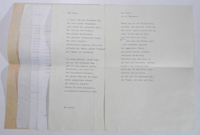 6 Blatt original Gedicht-Typoskripte von 1987. Dabei: "Du liebst..." / "Die Widmung gilt ihm" / "Der Norden" / "Dem Platz" (doppelt vorhanden, Text identisch, aber offensichtlich zweimal abgetippt) / "In der Romanzeit".(mit handschriftlicher Korrektur). Alle Blatt gefaltet im original Briefumschlag mit Kolbes seinerzeitigen Anschrift in Worpswede, adressiert an Anatol Erdmann in Berlin, mit Briefmarken und Stempeln. _. Provenienz: Aus dem Nachlaß von Anatol Erdmann. - Anatol Erdmann (1952 in Wologda/Sowjetunion - April 2024, Berlin) war ein in der Öffentlichkeit recht wortkarger, zurückgezogen lebender deutscher Graphiker und Bildhauer. Über sein Leben ist öffentlich nicht viel bekannt. Seine Familie siedelte Mitte der 1950er Jahre in die DDR über und 1964 zog er nach Berlin. Das Abitur machte er an einer Abendschule, teils heißt es freilich auch, er sei 1968 von der Schule geflogen. Ab 1975 arbeitete Erdmann im Atelier von Hans Scheib, mit dem ihm eine lebenslange Freundschaft verband. Seit 1978 war er Mitglied im Verband Bildender Künstler der DDR und veranstaltete noch im selben Jahr eine Gemeinschaftsausstellung mit Hans Scheib, Volker Henze und Reinhard Stangl. 1983 bezog er dann ein eigenes Atelier in der Lychener Straße. Heute noch erhalten, wenngleich abgebaut und eingelagert, ist der von ihm, Hans Scheib und Stefan Reichmann aus Metallschrott hergestellte Hirsch im nach dem Kunstwerk benannten legendären ?Hirschhof?, ein zusammenhängender Innenhofbereich an der Oderberger Straße/Kastanienallee, der in den 1980er Jahren unter Mitwirkung der damaligen Anwohner zu einer Grünanlage mit Spielplatz und Amphitheater ausgebaut wurde. Dieser diente in der DDR-Zeit als mehr oder weniger geheimer Treffpunkt der Untergrundkultur Ostberlins. Sogar die Stasi führte eine eigene Akte 'Hirschhof', kam aber wohl mit der Vielfältigkeit der Künstler und dem wechselhaften Publikums nicht zurecht. Obwohl Erdmann erst relativ kürzlich verstorben ist, ist öffentlich noch nicht einmal sein genaues Todesdatum bekannt. ----- BITTE BEACHTEN: Auf Grund der absurden und irrsinnig teuren staatlichen Regelungen für die Entsorgung der Versandpappen in den nachfolgenden Ländern, kann ich leider nicht mehr liefern nach: Österreich, Griechenland, Polen. Kunden in ÖSTERREICH können sich aber an die einheimische Post wenden, dort unter Alles Post Deutschland. --- PLEASE NOTE: Due to the absurd and insanely expensive government regulations for the disposal of shipping cartons in the following countries, I can unfortunately no longer deliver to: Austria, Greece, Poland. However, customers in AUSTRIA can contact their local post office, there under Alles Post Deutschland.