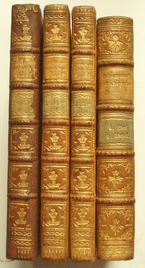 Apothekerlexikon 2 Teile in je 2 Abteilungen in vier Bänden. Mit 2 (wh.) gest. Titelvign. von [Georg] C[hristian] Schule, 2 (wh.) Titelholzschnitten, 3 gest. Tafeln u. 19 Textholzschnitten. Leipzig, S. L. Crusius, 1793-1799. 8vo. (ca. 20,5 x 12,0 cm). Schöne Halblederbände d. Zt. mit reicher Rückenvergoldung, 2 farbigen Rückenschildern u. dreiseitigem Rotschnitt.