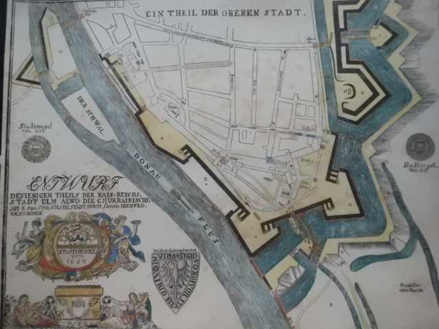 ENTWURF DESIENIGEN THEILS DER KAIS:REICHS=STADT ULM ALWO DIE CHURBAIRISCHE AM 8. Sept. 1702 SOLCHE STADT. DURCH Surprise HIENWEG=GENOMMEN. Kolorierter Holzschnitt von R. Ellenrieder. Ulm, 1844. 41,5 x 54 cm. (Mittelfalz, oben geringer Abrieb, insgesamt gut). Schefold 9626. Abbildung des Stadtteils von Ulm, in welchem der churbayerische Überfall am 8. Sept. 1702 stattfand (UBC S. 288 u. S. 258). Bemerkenswert die 4 Stadtsigel von 1244, 1383, 1650 und 1811. Rudolph Ellenrieder, Holzschneider, Kupferstecher und Lithograph (* Ulm 1781). Weyermann: "Ohne allen Unterricht lernte er Zeichnen, in Holz=Schneiden und auf Kupfer radiren; die ersten Holzschnitte versuchte er mit einem abgebrochenen Federmesser zu verfertigen; auch ist er Musiker und bläst die Trompete; in Ulm ist er als Kartenfabrikant etablirt.".