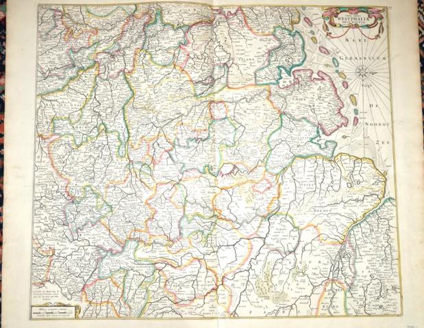 Nova Totius Westphaliae descriptio. Altkol. Kupferstich von de Wit, um 1680, 1680. Blattgröße ca. 53 x 63 cm. ? Unterrand mit kl. Fahlstelle, leicht gebraunt. Rechts in der Ecke Nummeriert (57) v. alter Hand. C2.