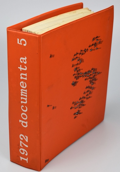 Documenta 5. Befragung der Realität, Bildwelten heute. Kassel, 30. Juni bis 8. Oktober 1972, Neue Galerie Schöne Aussicht, Museum Fridericianum Friedrichsplatz. Rundgang vom 4. Juni 1972 ; Verzeichnis der ausgestellten Werke, der präsentierten Situationen, der erwartbaren Ereignisse, ihrer Beschaffenheit, ihrer Hersteller und Besitzer, ihrer Organisation. Kassel, Selbstverlag, 1972. 4°. 31 x 27 cm. 64, 80 und ca. 700 Seiten. Original-Broschur und die weiteren losen Blatt mit Daumenregister in orangenem Original-Ringordner in der Gestaltung von Ed Ruscha (Ameisen zu einer 5 formiert). 1. Auflage. Katalog zur Documenta 5 vom 30. Juni bis 8. Oktober 1972, Museum Fridericianum, Friedrichsplatz, Neue Galerie. Mit dem 144-seitigen Rundgang vom 4. Juni 1972. Mit zahlreichen Abbildungen in Farbe und Schwarz-Weiß. Ohne die später erschienen Einlagen in die Register 19 bis 25. Exemplar des Kunsthistorikers Bernd Growe, mit Namenszug in Tinte auf Innendeckel des Ordners und erster Seite der Broschur. Ordner leicht berieben. Broschur mit kleineren Schabstellen. Daumenregister leicht gebräunt und vereinzelt in den Rändern etwas knickspurig, ansonsten sehr gutes Exemplar. Original softcover and the additional loose sheets with thumb index in original orange binder with title imprint and ant illustration on the cover. 1st edition. Catalogue for Documenta 5, from June 30 to October 8, 1972, Museum Fridericianum, Friedrichsplatz, Neue Galerie. With numerous colour and black-and-white illustrations. Copy from the collection of art historian Bernd Growe, with his signature in ink on the inside cover of the folder and the first page of the paperback. Lacking the later released registers 19 to 25. Binder lightly rubbed. Softcover with minor scuff marks. Thumb index slightly darkened and occasionally with minor creases at the edges, otherwise fine condition.