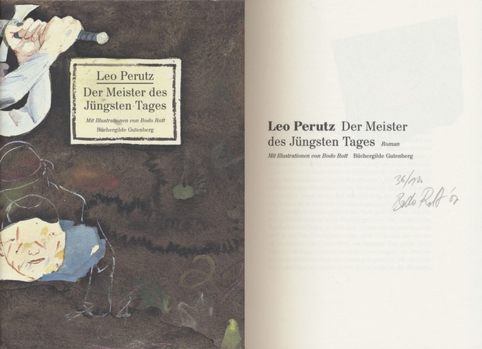 Der Meister des Jüngsten Tages. Mit Illustrationen von Bodo Rott. [Vorzugsausgabe mit Original-Lithografie]. Frankfurt am Main, Wien und Zürich, Büchergilde Gutenberg, 2007. Groß-8°. 24,5 x 17,5 cm. 235 (5) Seiten. Original-Leinenband mit Original-Schutzumschlag im Original-Pappschuber und mit Lesebändchen. Nummer 36 von 120 nummerierten und von Bodo Rott signierten Vorzugsausgaben. Beiliegend eine ebenfalls nummerierte und signierte Original-Lithografie von Bodo Rott. Blattgröße: 21,9 x 14,9 cm. Abbildungsgröße: 20,6 x 13,3 cm. Druck und Bindung besorgte Ebner & Spiegel in Ulm. Mit zahlreichen Abbildungen. Pappschuber lichtrandig, ansonsten sehr gutes Exemplar.