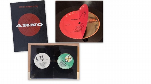 ARNO. White Ass European Cowboy (Book Art). Kurt Vanbelleghem: Imschoot, Gent (Belgium). 1999. Block besteht aus 17 Vinyl-LP-Platten, die auf 21 x 15 cm rechteckig abgeschnitten wurden. 4°. ----- A bound volume of 17 of 33 rpm vinyl LP recordings, mainly from the 1950s and 60s by various artists /// The Ventures, Elvis Presley, The Kinks, Bob Dylan (2x), Rod Stewart, Jacques Dutronc, Sonny Boy Williamson, Captain Beefheart and his Magic Band, Kevin Coyne, Robert Wyatt, Robert Johnson, Otis Redding, Humble Pie, PIL, Dr. John, Brazil Classics ---------- Arno, eigentlich Arnold Charles Ernest Hintjens, (* 21. Mai 1949 in Ostende; gest. 23. April 2022 in Brüssel) war ein belgischer Sänger. Arno begann seine musikalische Karriere in den frühen 1970er Jahren in Ostende. Er war nacheinander Mitglied der Formationen Freckle Face, Tjens Couter und TC Matic. Ab 1986 war er als Solokünstler aktiv. Nebst Eigenkompositionen vor allem in französischer und englischer, teilweise auch in flämischer Sprache, nahm er zahlreiche französische Chansons auf. Außerdem komponierte er die Musik für viele Filme. Wegen seiner rauen Stimme und der musikalischen Verwandtschaft wurde er auch als "belgischer Tom Waits" bezeichnet.
