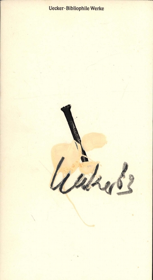 Bibliophile Werke. [Signiertes Exemplar, Unikat / Signed copy, unique] Düsseldorf, Esslingen, Kunsthalle Düsseldorf, Galerie der Stadt Esslingen, 1983. 4°. 29,7:16 cm cm. 33 Blatt. Original-Karton mit Original-Umschlag. Nummer 48 von 1000 nummerierten Exemplaren. Jedes Exemplar wurde von Günther Uecker auf der Vorderseite des Umschlages mit einer Original-Zeichnung (in Tusche und Deckweiß) versehen, signiert und datiert (83). Sehr schönes, sauberes Exemplar. Number 48 of 1,000 numbered copies. Original softcover with dust jacket. Each copy was signed and dated (83) by Günther Uecker on the front cover with an original drawing (in ink and opaque white). A very fine, clean copy.