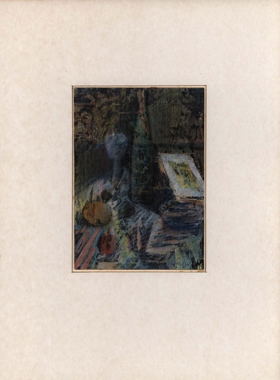 Stillleben in Hochform. [1982]. [Mischtechnik auf Karton / Mixed media on cardboard]. _. (László Faller, geboren 1930 in Söpte bei Szombathely/Ungarn, gestorben 1996 in Düsseldorf. Studium an der Kunstakademie in Budapest und Düsseldorf). Mischtechnik, Wachs, Buntstift auf Karton, dieser in einem Passepartout fixiert. Innerhalb der Abbildung unten rechts von Laszlo Faller in Blau signiert, rückseitig von fremder Hand beschriftet. Provenienz: Aus der Sammlung Wilhelm Blasberg. Maße Passepartout: 40,0 x 29,8 cm. Maße Blatt/Abbildung: 19,0 x 13,7 cm. Sehr guter Zustand. Mixed media, wax, and colored pencil on cardboard, mounted in a mount. Signed in blue by Laszlo Faller within the image lower right, inscribed on the verso by an unknown hand. Provenance: From the Wilhelm Blasberg Collection. Mount dimensions: 40.0 x 29.8 cm. Sheet/image dimensions: 19.0 x 13.7 cm. Very good condition.