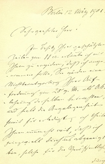 Eigenh. Brief mit U. Berlin, 12. März 1901. 1? SS. 8vo. An einen Journalisten mit einer Absage: ?[?] ich theile Ihnen nunmehr mit, daß ich prinzipiell durchaus abgeneigt bin, solche, für die Veröffentlichung durch die Presse bestimmten Meinungsäußerungen abzugeben, gleichviel ob es sich um den Simplicissimus oder um ein anderes Blatt handelt [?]?. ? Von 1852-61 lebte Knaus in Paris, unternahm anschließend zahlreiche Studienreisen, u.a. in die Schweiz, nach Großbritannien, Italien, Belgien und in die Niederlande. In den folgenden Jahren verbrachte K. den Sommer in seinem Atelier auf dem Gaisberg bei Wiesbaden und den Winter in Berlin, wo er sich 1874 endgültig niederließ und als Prof. an der Akademie der bildenden Künste tätig war (bis 1882). Seit 1905 gehörte er als korrespondierendes Mitglied der Preußischen Akademie der Künste an. Knaus, zu Lebzeiten mit Adolf Menzel verglichen und als führender Repräsentant der deutschen Malerei gefeiert, schuf neben zahlreichen Portraits insbesondere Genremalerei. Zu seinen Werken zählen u.a. ?Der Falschspieler?, ?Morgen nach der Kirchweih? (1853) und ?Schwarzwälder Bauern in der Schenke? (1853).