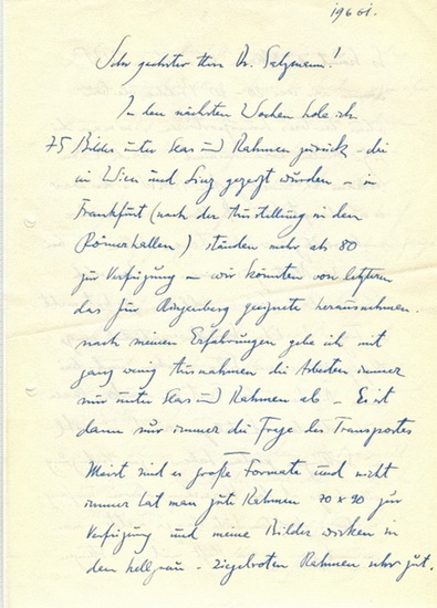 Eigenh. Brief mit U. O. O., 19. Juni 1961. 3 SS. Gr.-4to. Gelocht. An den Kunsthistoriker Siegfried Salzmann (1928?1993): ?[?] In den nächsten Wochen hole ich 75 Bilder unter Glas und Rahmen zurück ? die in Wien und Linz gezeigt wurden ? in Frankfurt (nach der Ausstellung in den Römerhallen) stünden mehr als 80 zur Verfügung ? wir könnten von letzterem das für Ringenberg geeignete herausnehmen. Nach meinen Erfahrungen gebe ich mit ganz wenig Ausnahmen die Arbeiten immer nur unter Glas und Rahmen ab ? Es ist dann nur immer die Frage des Transportes. Meist sind es große Formate und nicht immer hat man gute Rahmen 70x90 zur Verfügung und meine Bilder wirken in den hellgrau-ziegelroten Rahmen sehr gut. Es könnte ein Mann sie in einem VW wenn wir bei 20-30 Bilder bleiben ohne weiteres transportieren ? so man die Sitze hinten herausnimmt. Nach Wien bekam ich einen großen BMW ? da war es überhaupt kein Problem. [?]?. ? Zunächst Autodidakt, besuchte Weber von 1911-13 die Kunstgewerbeschule in Erfurt, arbeitete für die ?Leipziger Illustrierte Zeitung? und war im Ersten Weltkrieg als Kriegszeichner eingesetzt. 1917 illustrierte er mit Paul Lingens Requiem das erste von mehr als 60 Büchern. 1925 gründete er die ?Clan-Presse? zur Herstellung eigener Lithographien. 1928 trat er in Kontakt zum Widerstandskreis um Ernst Niekisch, für dessen Zeitschriften ?Widerstand? und ?Entscheidung? er politische Satiren zeichnete. Er illustrierte auch Niekischs Schrift ?Hitler -- ein deutsches Verhängnis? (1932). 1937 wurde er von der Gestapo verhaftet, nach der Entlassung entstanden die Blattfolgen ?Die Schachspieler? und ?Die Gefangenen?. Nach Kriegsende begann er mit der Gestaltung der Handwerkerbilder, der sog. Winheimer Drucke, 1954-67 war er Mitarbeiter des Münchner ?Simplicissimus?. ? Siegfried Salzmann war von 1971 bis 1984 Direktor des Wilhelm Lehmbruck-Museums in Duisburg und anschließend bis 1993 Direktor der Kunsthalle Bremen.