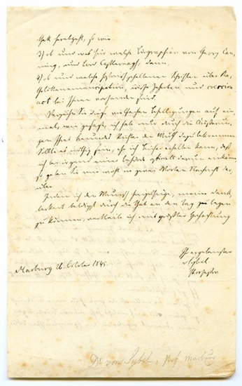 Eigenh. Brief mit U. (?vSybel?). Marburg, 26. Oktober 1845. 1? SS. Gr.-8vo. An einen namentlich nicht genannten Adressaten: ?Nachdem mir Herr Professor Richter gesagt hat, mit welch dankenswerther Bereitwilligkeit Sie bei Ihrer letzten Anwesenheit in Marburg Sie [!] sich über meine Wünsche in Betreff Ihrer Universitäts Bibliothek ausgesprochen, erlaube ich mir, die einliegenden Scheine unmittelbar an Ihre Adresse abgehen zu lassen, und folgende Bitten noch hinzuzufügen [...]?. ? Heinrich von Sybel, ein Schüler Leopold von Rankes, war Professor in Bonn, Marburg und München, Mitglied des Frankfurter Vorparlaments, der Kasseler Ständeversammlung, des Ständehauses des Erfurter Unionsparlaments und des preußischen Abgeordnetenhauses; 1867 wurde er in den konstituierenden Reichstag gewählt. In München, wo er seit 1856 lehrte, gründete er 1859 die ?Historische Zeitschrift?, die er bis zu seinem Tod als Herausgeber betreute; von 1859 bis 1886 Sekretär der von Leopold von Ranke und ihm gegründeten ?Historischen Kommission bei der Bayerischen Akademie der Wissenschaften? und danach deren Präsident, wurde Sybel 1875 auch Direktor der preußischen Staatsarchive. Er ?förderte die Quellenpublikationen der ?Monumenta Germaniae Historica? und der ?Acta Borussica?, leitete das von ihm gegründete Deutsche Historische Institut in Rom und betreute die Herausgabe der päpstlichen Nuntiaturberichte? (DBE). Sybel, der als Hauptvertreter der kleindeutschen Geschichtsschreibung gilt, veröffentlichte u. a. eine ?Geschichte des ersten Kreuzzugs? (1841), ?Die Geschichte der Revolutionszeit von 1789?95? (1853?79), ?ein zu seiner Zeit bahnbrechendes Werk? (ebd.), und ?Die Begründung des deutschen Reiches durch Wilhelm I.? (1889?94). ? Papierbedingt leicht gebräunt und etwas fleckig; ohne die erwähnte Beilage.