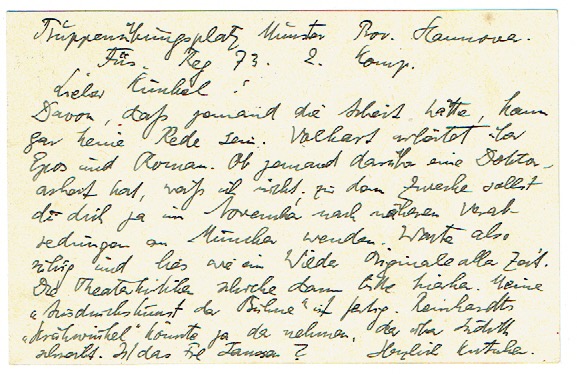 Eigenh. Postkarte mit U. Münster, [23. August 1908]. 1 S. Qu.-8vo. Mit eh. Adresse. An Georg Kunkel: ?[...] Ob jemand darüber eine Doktorarbeit hat, weiß ich nicht; zu dem Zwecke sollst du dich ja im November nach näheren Verabredungen an München wenden. Warte also ruhig und lies wie ein Wilder Originale aller Zeit. Die Theaterkritiken schicke dann bitte hierher. Meine ?Ausdruckskunst der Bühne? ist fertig. Reinhardts ?Krähwinkel? könnte ja der nehmen, der schon Judith schreibt [...]?. ? Artur Kutscher ließ sich nach einem Studium der Literaturwissenschaft in München nieder, wo u. a. Otto Falckenberg, Frank Wedekind, Hermann Löns und Max Halbe zu seinem Freundeskreis zählten. 1907 habilitierte er sich in Berlin für Literaturwissenschaft, wurde im selben Jahr Privatdozent und acht Jahre später a.o.Prof. in München. ?Aus dem 1908 gegründeten Kutscher-Seminar gingen bedeutende Schriftsteller und Theaterleute hervor, darunter Erwin Piscator und Bertolt Brecht. Kutscher forderte, ausgehend von der These, Theater sei mimisch, nicht literarisch zu erfassen, seit 1909 die Schaffung einer neuen Disziplin Theaterwissenschaft, als deren Begründer er gilt. Er unternahm seit 1910 Exkursionen zu Theatern in Süddeutschland, später in ganz Europa, veranstaltete Autoren-Abende des sogenannten Kutscher-Kreises in Schwabinger Lokalen und spielte Theater mit seinen Studenten. Nach dem Tod Wedekinds 1918 ordnete er dessen Nachlaß und schrieb seine Biographie? (DBE).