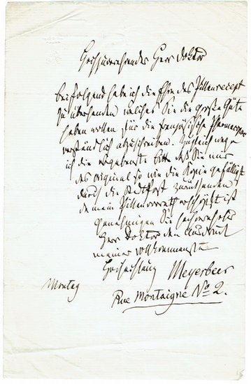 Eigenhändiger Brief mit Unterschrift. ohne Ort [Paris], ?Montag?. 8vo. 1 p. An einen namentlich nicht genannten Mediziner in Paris: ?beifolgend habe ich die Ehre das Pillenrecept zu übersenden welches Sie die große Güte haben wollen für die französische Pharmacie [?] verständlich abzuschreiben. Zugleich wage ich die ergebenste Bitte daß Sie mir das Original so wie die Kopie gefälligst durch die Stadtpost zurücksenden da mein Pillenvorrath erschöpft ist. [?]?.