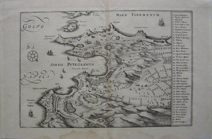 Golfo di Napoli (auch Sinus Puteolanus). Ansicht aus der Vogelschau mit dem Golf von Neapel, mit Ischia, der Insel Procida, Pozzuoli und Baia. _. Orig. Kupferstich von Matthäus Merian; aus: "Itinerarium Italiae Nova Antiqua", Frankfurt, 1640; rechts Erklärungen von 1-42. 20,3 x 30 cm , Blattgröße 25 x 38 cm. - Im Mittelfalz und im unteren Rand etwas gebräunt.