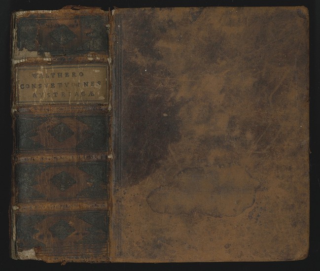 Consuetudines Austriacae. Ad Stylum Excelsi Regiminis Infra Anasum Olim Accomodatae [...] Nunc vero accesserunt Additiones paedictarum Consuetudinum Austriacum Renovatae; Nec non Aureus Juris Austriaci Tractatus, continens Obervationes Selectas [...]. Nürnberg, Martin Endter 1718. 8°. Titel in Rot und Schwarz, 1051 (1) S., 44 Bll., Zwischentitel, 104 S., 7 Bll. mit 1 Portraitfrontispiz. Ldr.-Bd. d. Zeit mit geprägtem Rückenschildchen. Einband berieben, Rücken mit Fehlstellen an den Kapitalen, stockfleckig. Titelbl. am unteren Rand dezent verstärkt, Spiegel mit zeitgen. Besitzvermerk u. priv. Stempel. VD 18 14891271; NDB XXVII, 370f. (Walther). - Umfangreiches Werk zur österreichsichen Gesetzgebung vom 16. bis frühen 18. Jahrhundert, von Johann Baptist Suttinger (1608-1662) mit einem Anhang von Bernhard Walther (1516-1584), der als "Vater der österreichischen Jurisprudenz" gilt. Das Titelportrait zeigt Karl VI.