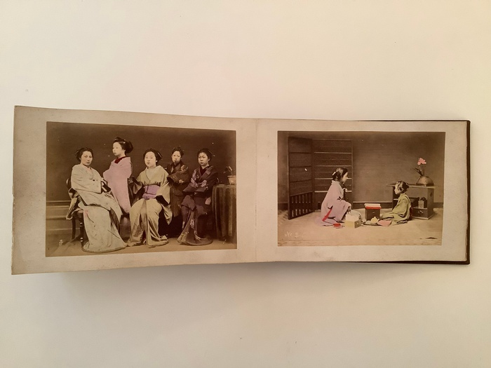 Leporello-Album with 23 mounted coloured photographs of Japanese Woman. Tokyo., ca. 1900. 12,5 : 18 cm. Leporello with 23 mounted coloured photographs on stiff cardboard. Cloth binding. Very rare made up leporello showing only Japanese Woman in every-day scenes, get together, trinking tea, washing cloth, riding in a rickshaw, hairdressing, in different kimonos etc. It is extremely rara to find an album just with woman.
