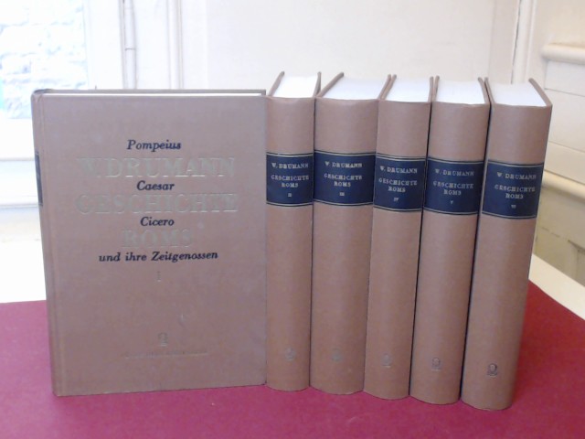 Geschichte Roms in seinem Übergang von der republikanischen zur monarchischen Verfassung oder Pompeius, Caesar, Cicero und ihre Zeitgenossen nach Geschlechtern und mit genealogischen Tabellen (vollständig in 6 Bänden). Hildesheim: Georg Olms, 1964. Nachdruck der 2. Auflage Berlin 1899. Orig.-Leinenbände. Einbände leicht berieben, sonst handelt es sich um ein gutes Exemplar mit nur leichten Gebrauchsspuren. Band 1 mit Namenseintrag auf den ersten Seiten, ansonsten sind die Bände textsauber. Bücher aus einem Nichtraucherhaushalt.