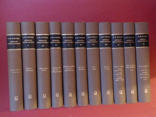 Annales Typographici (vollständig in 11 Bänden). Hildesheim: Georg Olms, 1963-1964. Reprografischer Nachdruck der Ausgabe Nürnberg 1793-1803. Orig.-Leinenbände. Gutes Exemplar mit nur leichten Gebrauchsspuren. Ecken und Kanten weniger Bände sehr leicht berieben. Exemplar mit sehr wenigen Bleistiftanstreichungen und -anmerkungen auf vereinzelten Seiten. Bücher aus einem Nichtraucherhaushalt. Sprache Lateinisch. Dieses Exemplar stammt aus der Bibliothek von Peter Amelung (Württembergische Landesbibliothek Stuttgart). // Original hardcovers. Books are in good condition. Corners and edges of a few volumes are very slightly rubbed; very few pages contain some pencil markings and annotations. Books from a non smoking environment. Language: Latin.
