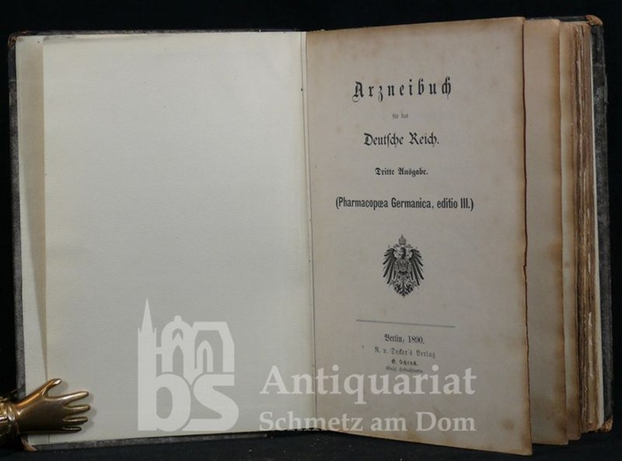 Arzneibuch für das Deutsche Reich. Dritte Ausgabe. (Pharmacopoea Germanica, editio III.) Bln, Decker 1890. Gr.8°. 2 Bll., XII, 432 S. Vorsätze und Rücken unter Verwendung des originalen Rückens erneuert. Teils stockfleckig und im Rand etwas gebräunt. Die Deckel etwas fleckig, Ecken bestoßen. Teils durchschossen, mit vielen hs. Anmerkungen. Auch mit montierten Korrekturzusätzen und Aktualisierungen (ursprünglicher Text dann dort stellenweise auch überklebt).