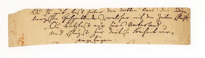 Eigenh. Briefausschnitt. O. O. u. D. Qu.-schmal-gr.-8vo (ca. 41:215 mm). Fragment eines Briefes mit der Bitte, "hinter dem dritten Vers des Dürnbergschen [?] Hochzeitsliedes" eine Einfügung vorzunehmen. - In altem Sammlungsumschlag.